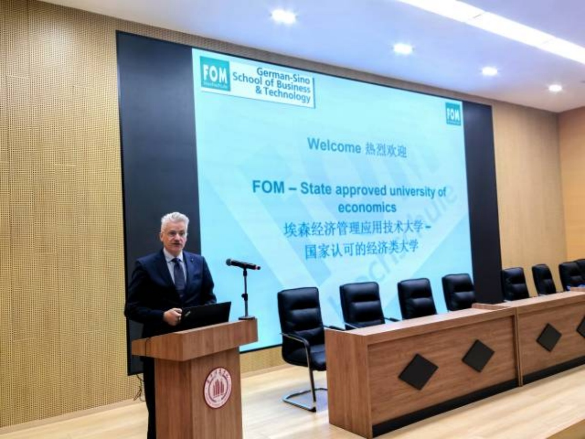 讲座中,Andreas Stoffers教授围绕FOM大学的课程体系与核心优势展开分享。他详细介绍了该校在应用型人才培养方面的特色课程设计,以及与行业接轨的教学模式,让在场师生对德国高等教育的实践导向有了直观认识。
