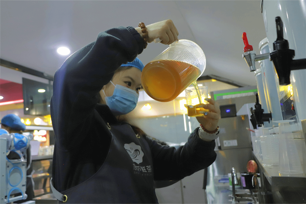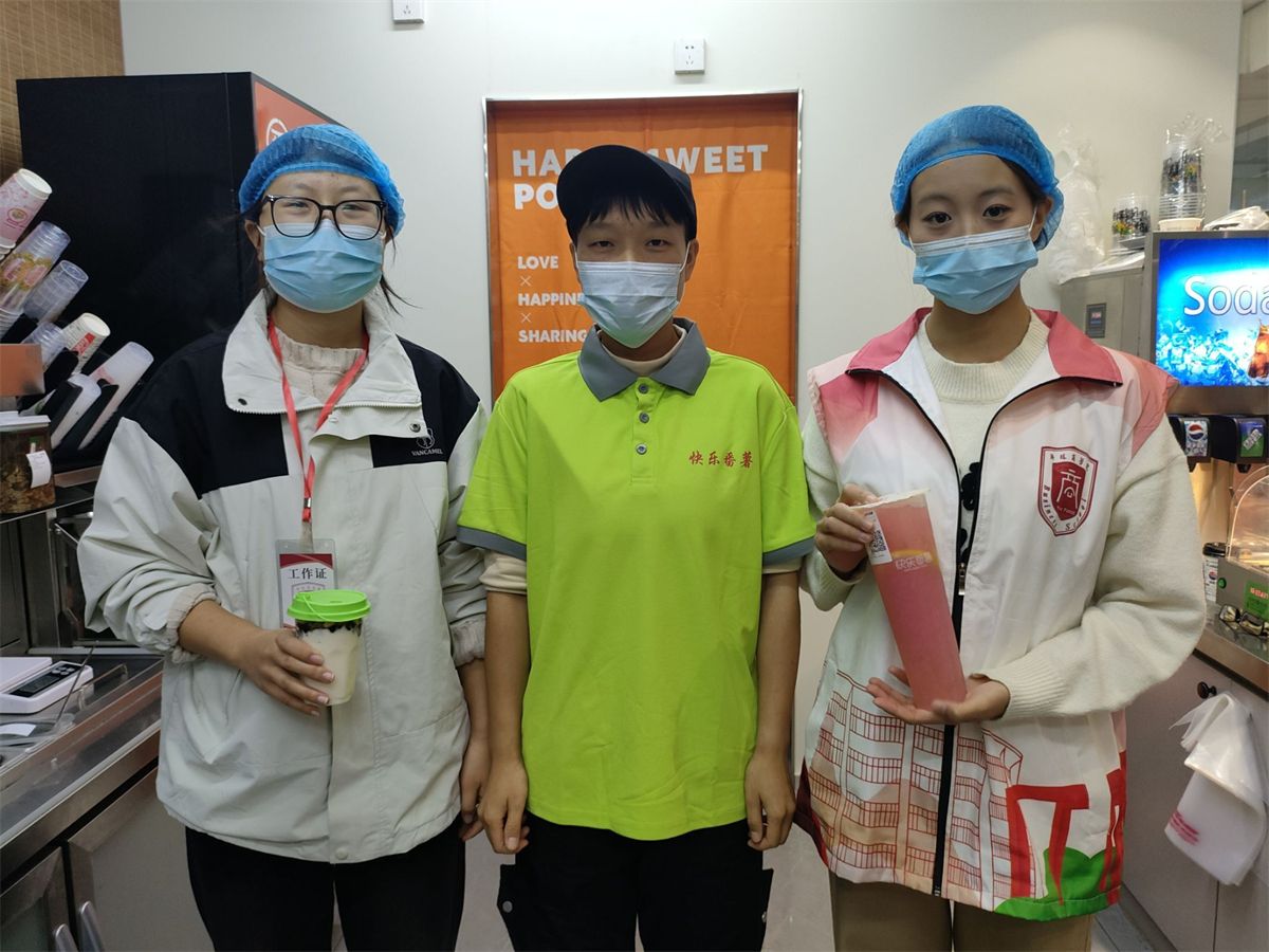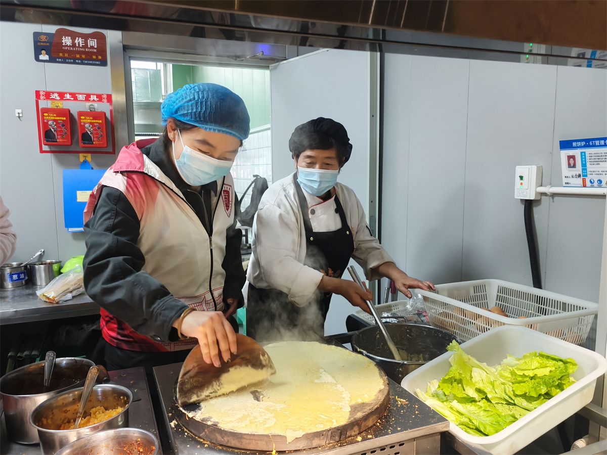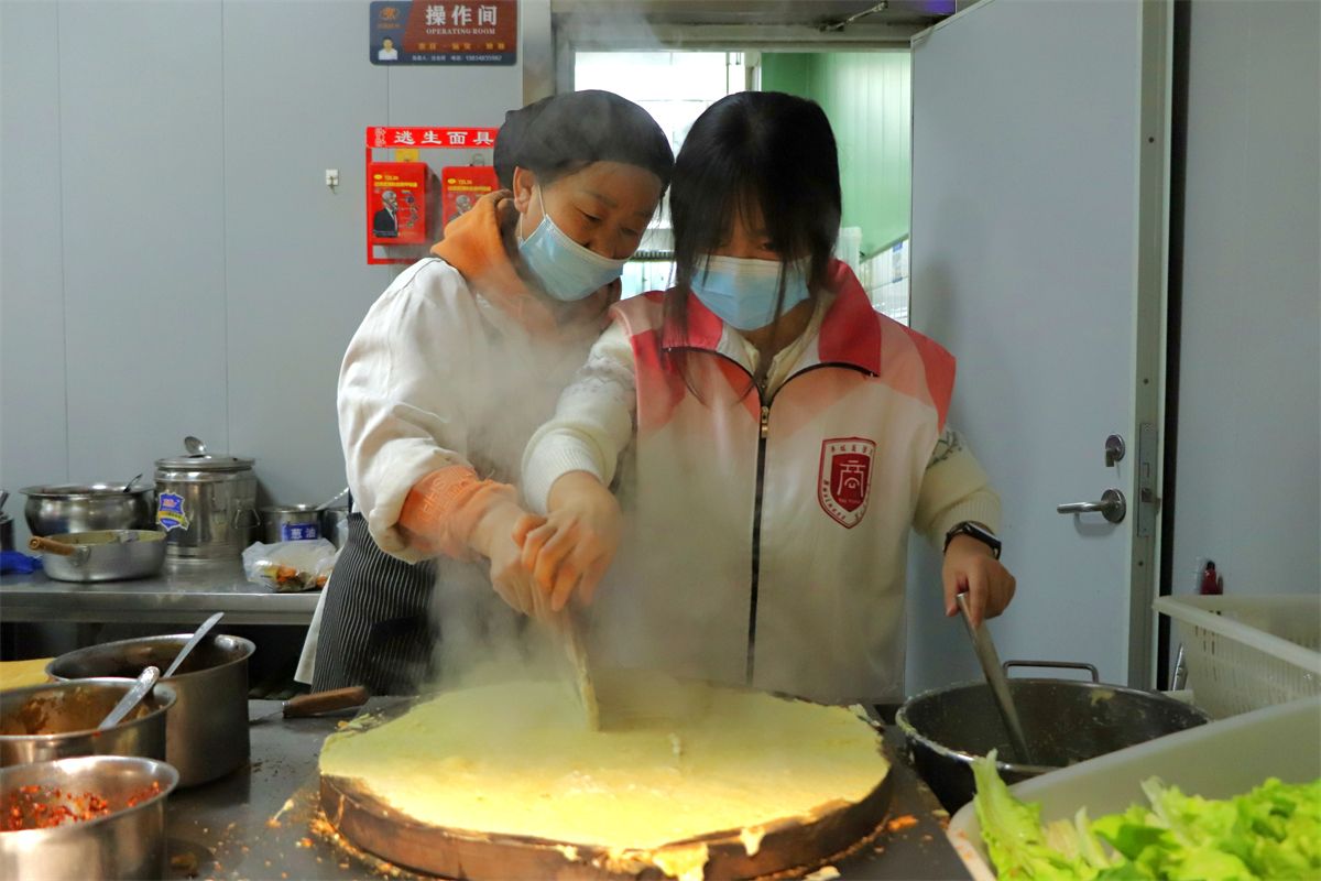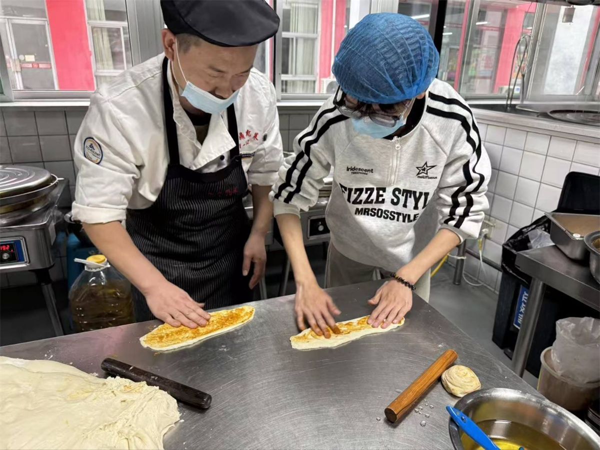 同学们规范穿戴好厨师服与厨师帽,专业形象瞬间凸显,4个体验项目同步推进,厨房里锅碗瓢盆的碰撞声、同学们的笑声交织成热闹的“交响曲”。煎饼组手忙脚乱地学习着,同学们舀面、摊匀、放鸡蛋、翻面刷酱,焦香裹着脆渣,成就感溢满。在清爽饮品制作组,蜂蜜柚子茶的果香引来围观,沁人心脾。面点制作组更是热闹非凡,同学们把面团反复揉压成光滑的“小枕头”,沾着面粉的手反复调整,最终把“歪歪扭扭”的面点变成了能入口的成品,也更加体会到了食堂工作人员的辛苦。