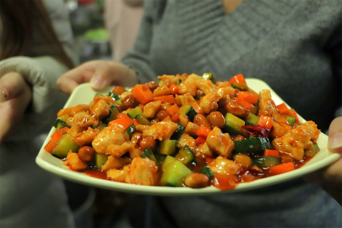 忙了1个多小时,各小组端着饮品、饼子、馄饨、热菜等劳动成果,雄赳赳气昂昂来到展示区。热菜组的番茄炒蛋、干锅土豆、宫保鸡丁等菜色香味俱全;面点组的“创意包子”“不规则饺子”兼具可爱与美味;饮品区的柠檬气泡水引得路过同学纷纷驻足。更有意思的是,食堂大厨们也端来自己的招牌菜,和同学们“同台PK”:大厨做的糖醋里脊色泽均匀,裹着亮晶晶的酱汁;学生们做的虽然卖相稍逊,但酱汁也裹得满满当当,透着认真劲儿;大厨包的包子大小一致,像“复制粘贴”的;学子们的“元宝包子”则圆滚滚的,充满童趣。