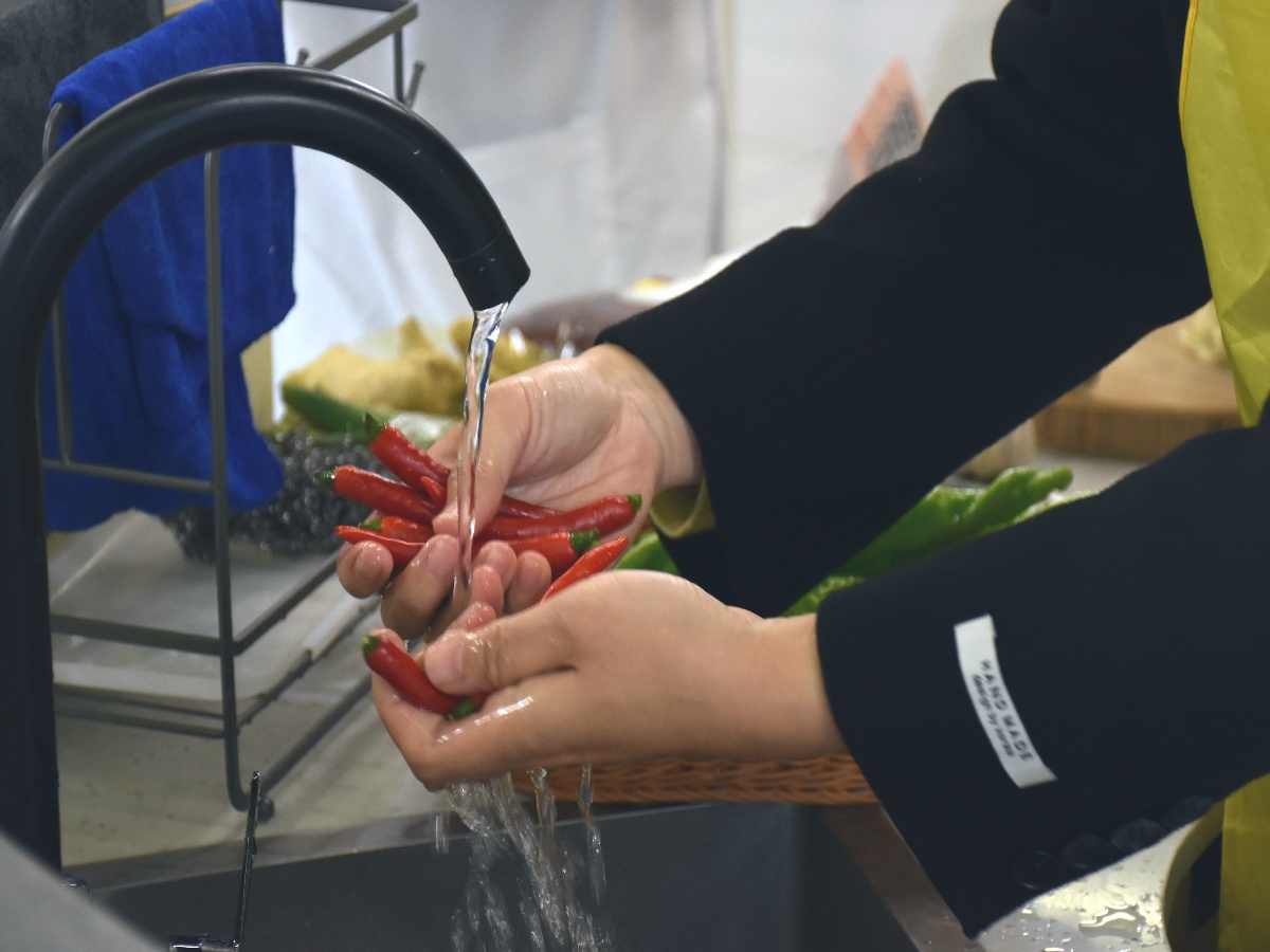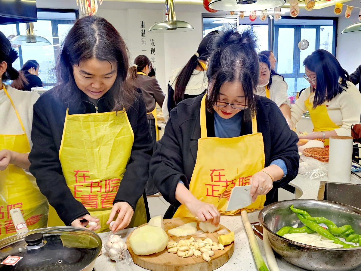 活动现场暖意融融!大健康学院的安丽霞老师和张芳老师莅临指导,并手把手示范辣椒酱、西红柿酱与芥菜丝的制作技艺。案台上新鲜食材整齐排列,老师一边细致处理食材,一边耐心讲解。