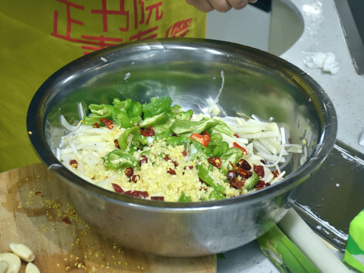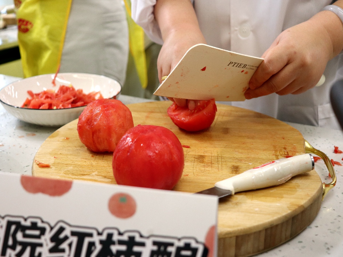“西红柿要选熟透发软的,开水烫一下剥去皮,切成块放锅里,小火慢慢熬,边熬边搅,熬到浓稠加点盐调味就好啦!”“芥菜洗净削掉皮,切成细丝,撒上盐抓匀,腌半小时把水挤干,拌匀静置10分钟就能吃,脆爽解腻,配粥超合适!”老师们一下子就摸清了传统酱料的制作门道。
