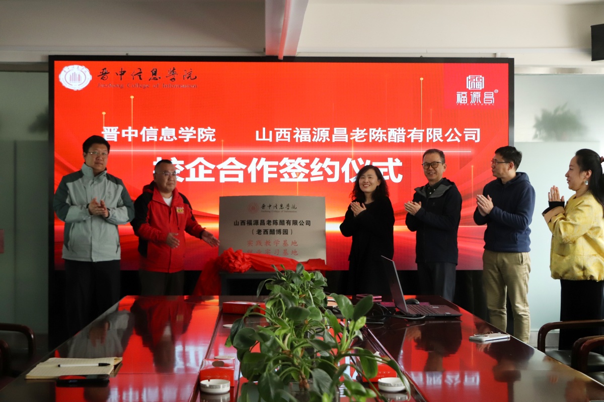 签约仪式上,双方共同签署了合作协议,并为“晋中信息学院——山西福源昌老陈醋有限公司实践基地”揭牌。廖成林教授在致辞中强调:“此次实践基地的建立,不仅标志着校企合作迈入了一个崭新的阶段,更为双方未来的协同发展奠定了坚实的基础。未来双方要进一步细化合作内容,在课程开发、实习实训、科研成果转化、品牌宣传等方面展开深度合作,力求打造校企合作的标杆项目。”