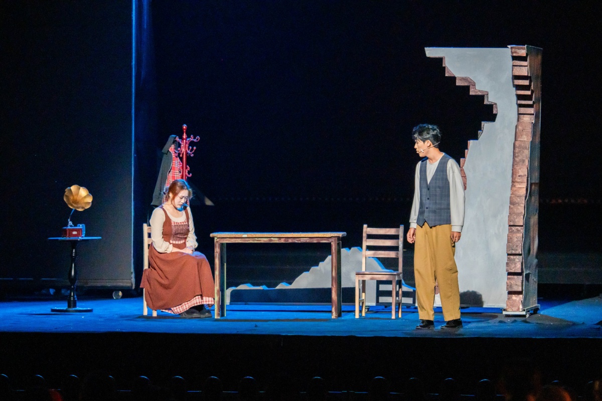 11月14日19:00,学校艺术教育中心张子一老师编导的原创话剧《囚禁》在西昌火把广场·火舞台上演。该剧聚焦时代洪流中挣扎的女性群体与底层劳动者,以劳拉与里昂的婚姻为主线,揭露底层工人在资本压迫与战争阴影下的苦难。舞台布景采用写实主义风格,残破的墙面与简陋的家具构建具有象征意义的“家”,暗示战争摧残与生活拮据,营造压抑氛围。场面调度上,通过灯光变化“穿插”未出场家庭成员,实现场景切换,暗示了情感纠葛,虚实结合丰富视觉层次。