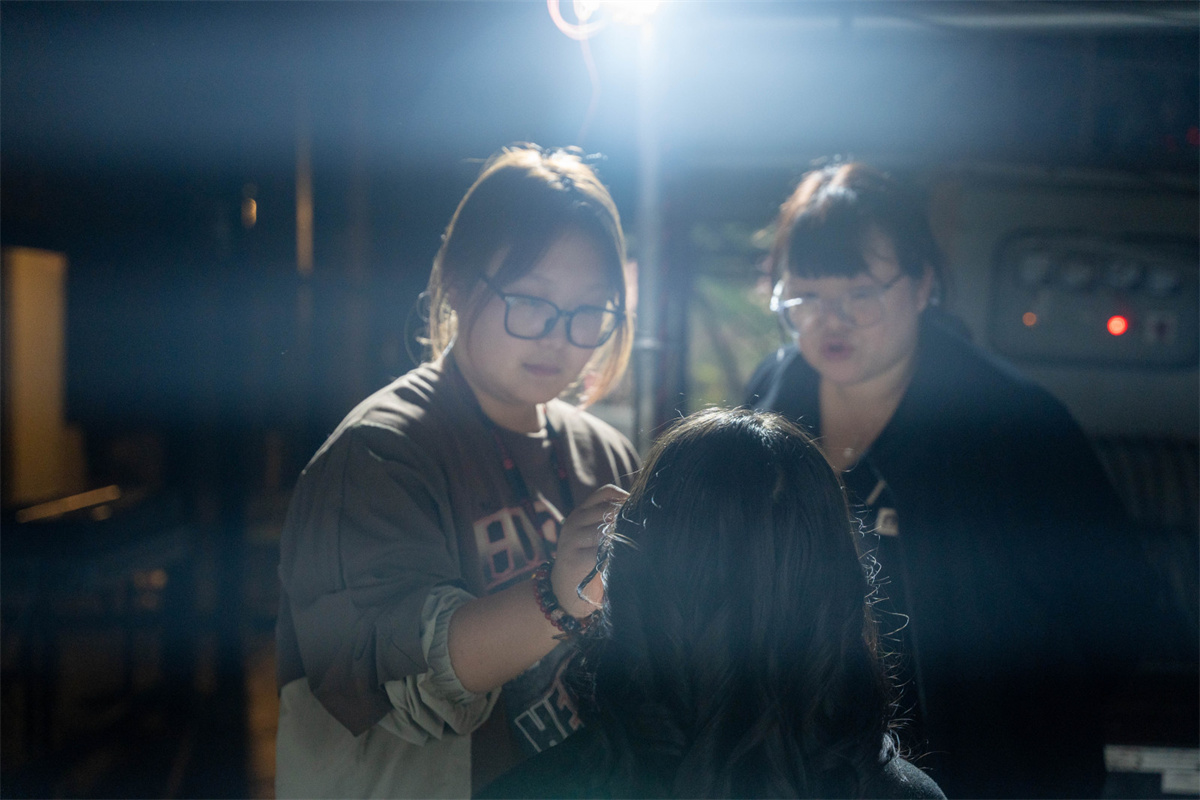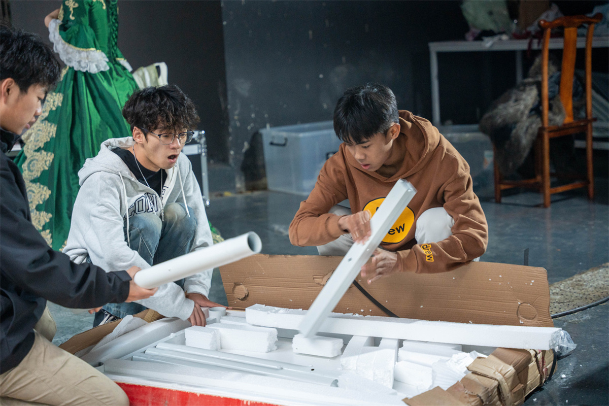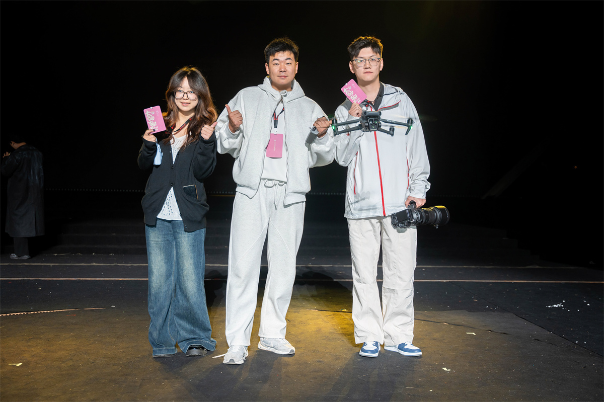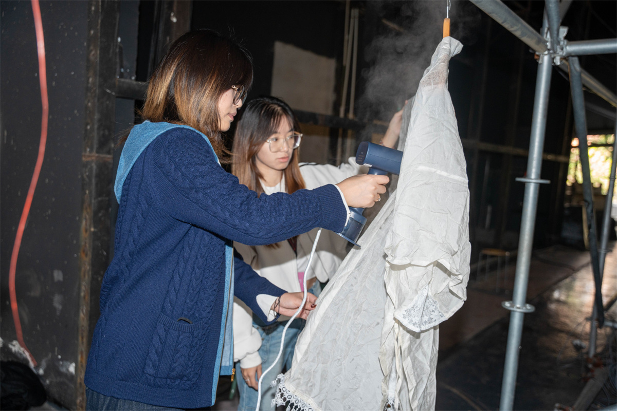 后台化妆间里,化妆师吴颖娴同学,怀着忐忑又热忱的心情投入工作。“这是我第一次参与如此盛大的戏剧节,握着化妆刷为演员勾勒贴合角色的眉眼,看着他们从青涩的样子变为剧中人在舞台发光,成就感满满。”而服装师杨淇同学正细心熨烫着演员们的服装:“特别感谢学校给的机会!作为非服装专业的爱好者,我在大凉山学到了很多彝族服饰的非遗特色,回去后想跟着老师深耕这一领域,让传统之美融入创作。”舞台一侧,宣传团队的摄影摄像记者、文字记者,正以专业视角捕捉着每一个值得定格的瞬间,相机与无人机的灵活切换,既定格了演员演绎的细腻质感,也记录了舞台呈现的细节亮点,全方位留存下演出的精彩全貌。整个剧场内,台前幕后,每一个人都在用专业与热爱,共同书写这场戏剧之旅的精彩篇章。