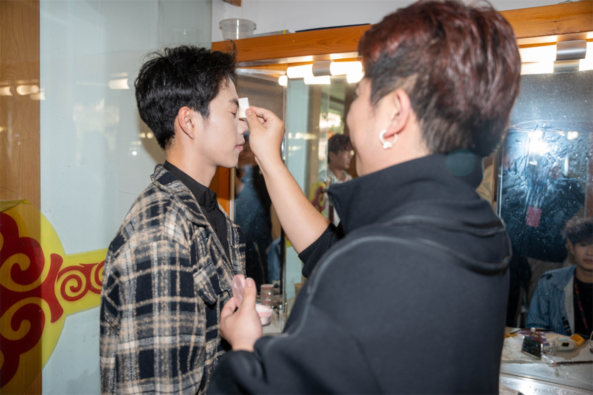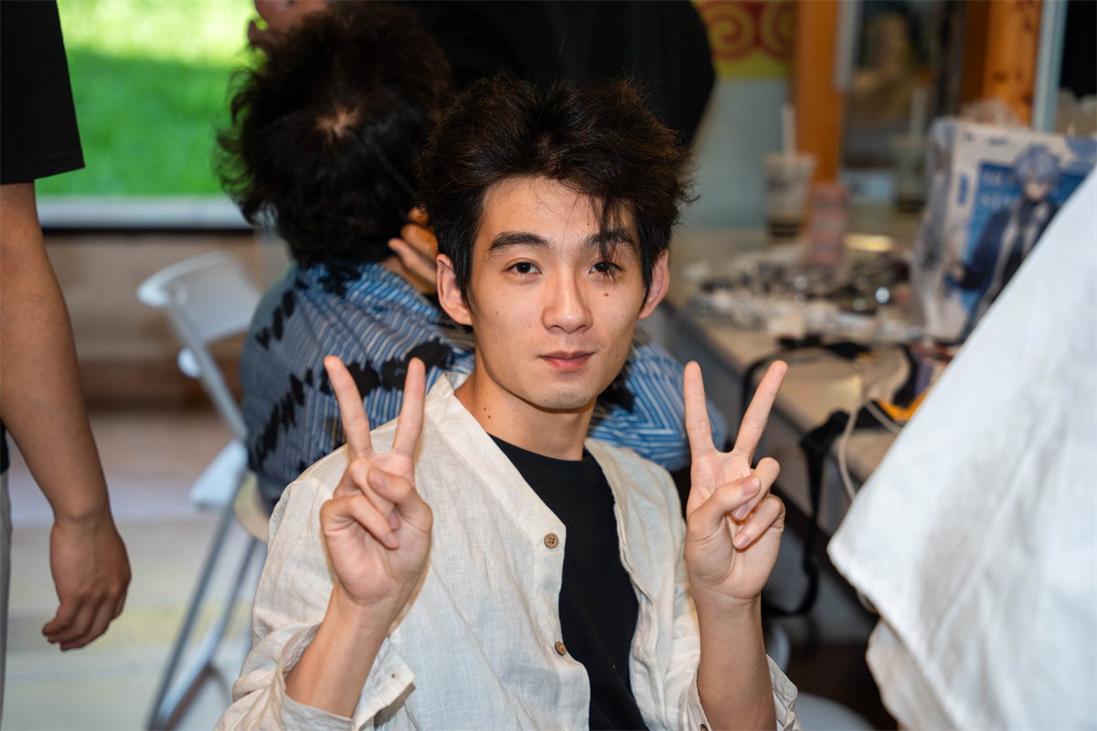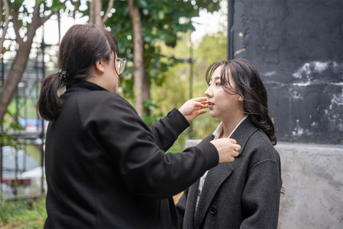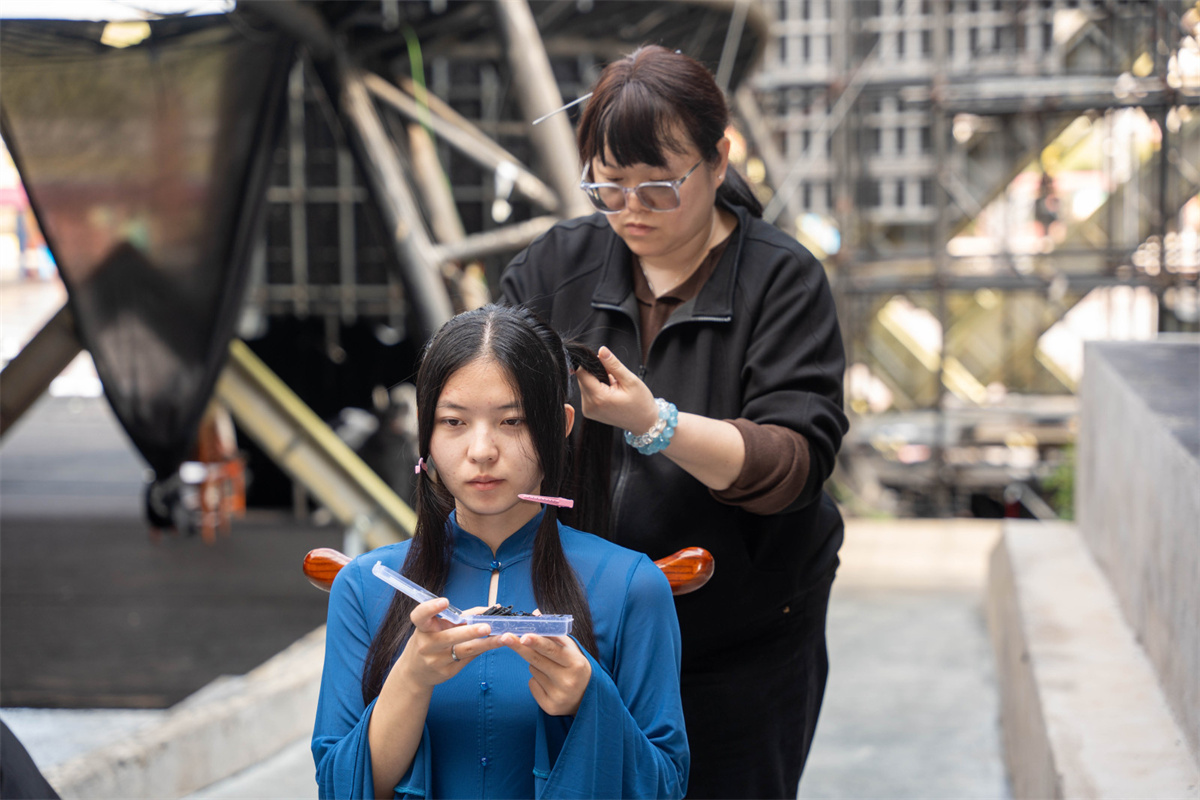 后台化妆间里,化妆师吴颖娴同学,怀着忐忑又热忱的心情投入工作。“这是我第一次参与如此盛大的戏剧节,握着化妆刷为演员勾勒贴合角色的眉眼,看着他们从青涩的样子变为剧中人在舞台发光,成就感满满。”而服装师杨淇同学正细心熨烫着演员们的服装:“特别感谢学校给的机会!作为非服装专业的爱好者,我在大凉山学到了很多彝族服饰的非遗特色,回去后想跟着老师深耕这一领域,让传统之美融入创作。”舞台一侧,宣传团队的摄影摄像记者、文字记者,正以专业视角捕捉着每一个值得定格的瞬间,相机与无人机的灵活切换,既定格了演员演绎的细腻质感,也记录了舞台呈现的细节亮点,全方位留存下演出的精彩全貌。整个剧场内,台前幕后,每一个人都在用专业与热爱,共同书写这场戏剧之旅的精彩篇章。
