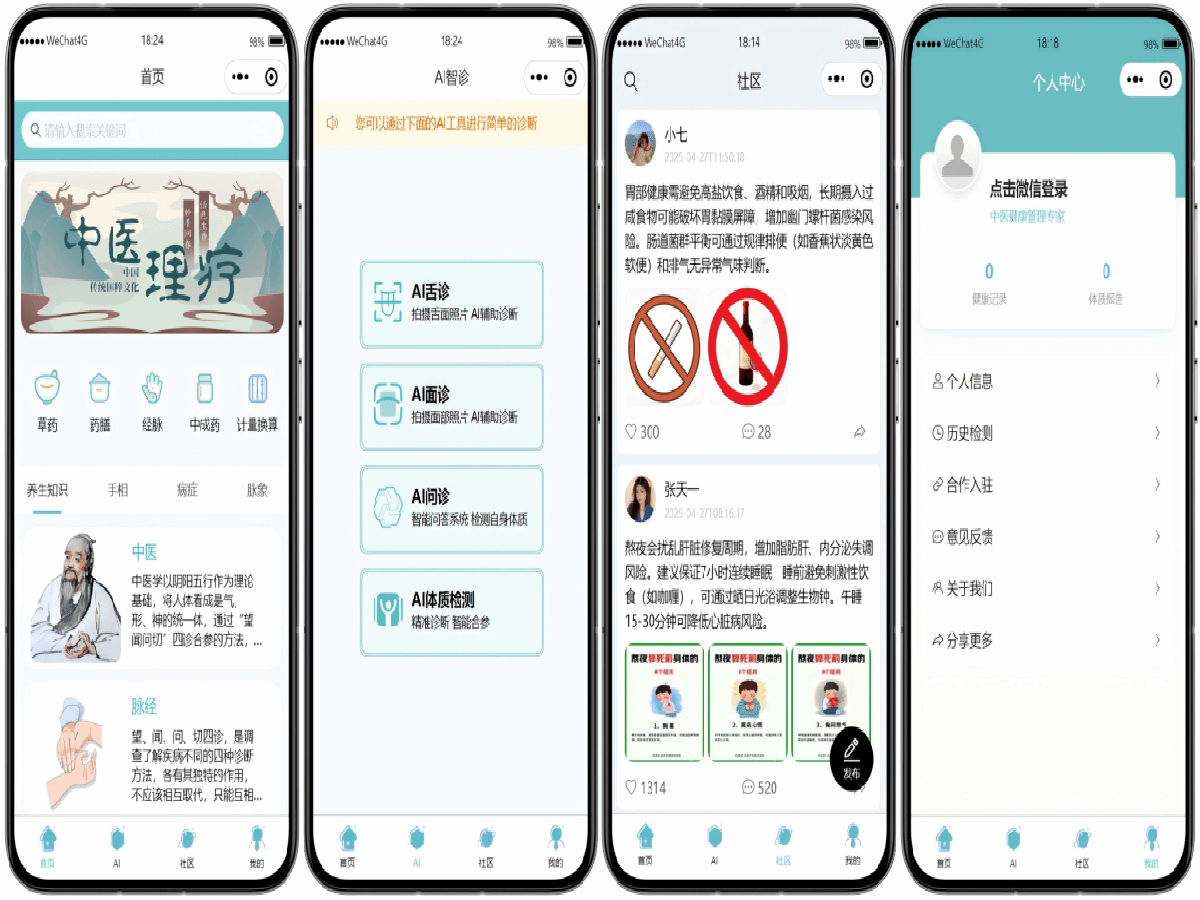 项目介绍:快节奏的现代生活里,健康管理早已成为人们关注的核心课题。中医作为中华文明传承千年的瑰宝,凭借“治未病”的前瞻预防理念与整体调养的独特优势,为奔波的现代人提供了顺应自然、平衡身心的健康新范式。正是基于这一千年智慧,精心打造“灵枢识慧”微信小程序,以科技为纽带深度融合传统中医智慧,构建起集知识获取、智能诊断、健康管理于一体的综合性中医服务平台。“灵枢识慧”采用双端协同架构,既保障用户体验的便捷性,又兼顾运营管理的高效性。用户端整合四大核心模块:中医知识库涵盖草药、经脉、药膳等实用内容,AI智能诊断支持问诊、舌诊、面诊及体质检测,个性化养生方案按需定制,互动社区助力交流分享;搭配微信一键登录,让传统养生智慧真正触手可及。管理端则以完善的用户管理、内容维护、数据分析系统,确保服务始终专业、及时。