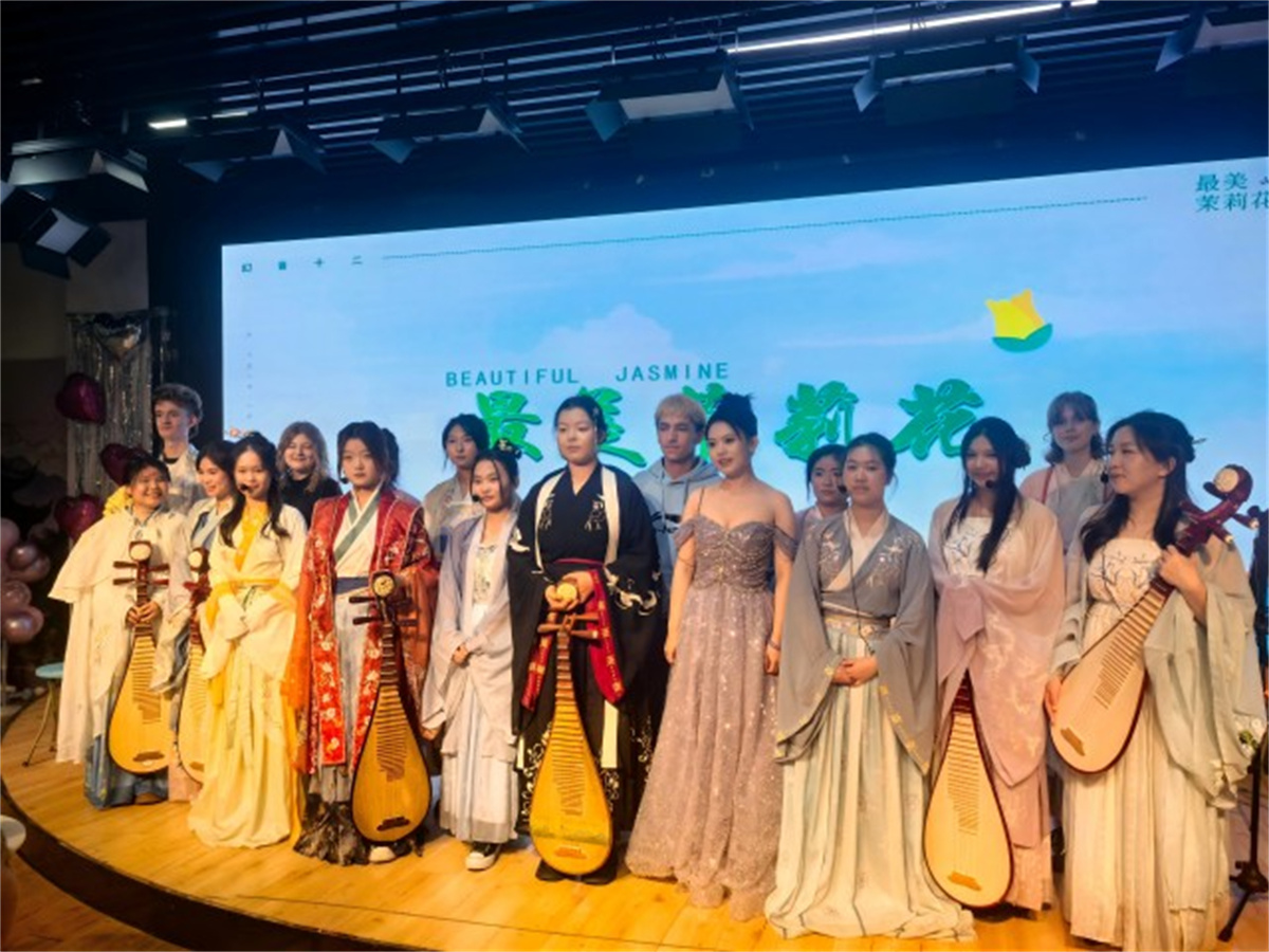 在酒会间歇,来自国际交流学院的留学生们一起登台,指尖轻拨琵琶弦,《茉莉花》的悠扬旋律随即在会场响起。这段不到三分钟的演奏,成为酒会现场最温暖的“文化共鸣点”也为后续的跨文化交流环节埋下伏笔成为跨文化协作的生动体现。