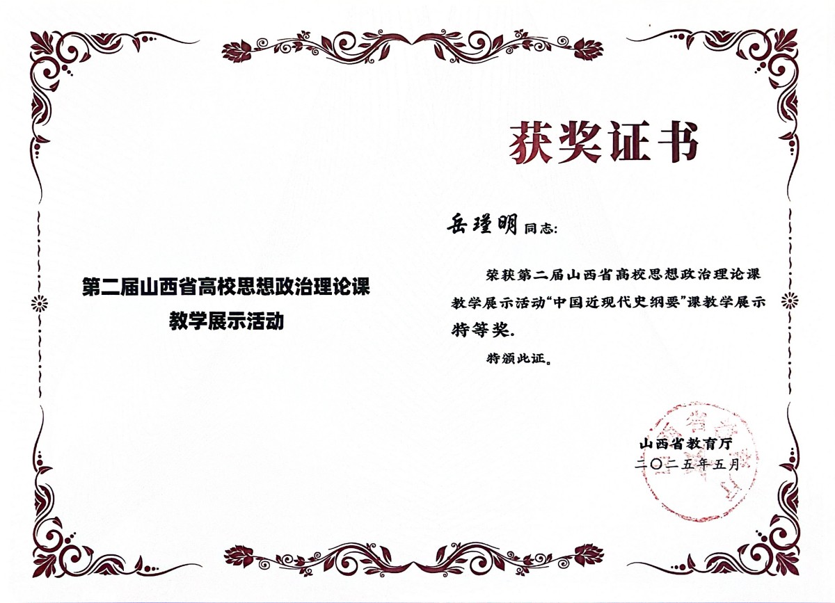 一分耕耘,一分收获。坚持不懈的教学改革终于结出硕果:2023年,我荣获学校教学创新大赛二等奖;今年,在第二届山西省高校思想政治理论课教学展示活动中,我将多年积累的改革实践融入教学设计,最终斩获特等奖,并成功晋级国赛。这份沉甸甸的荣誉,既是激励我继续前行的动力,也让我更加笃定:教学改革,改的是方法;守的,永远是那一份育人初心。