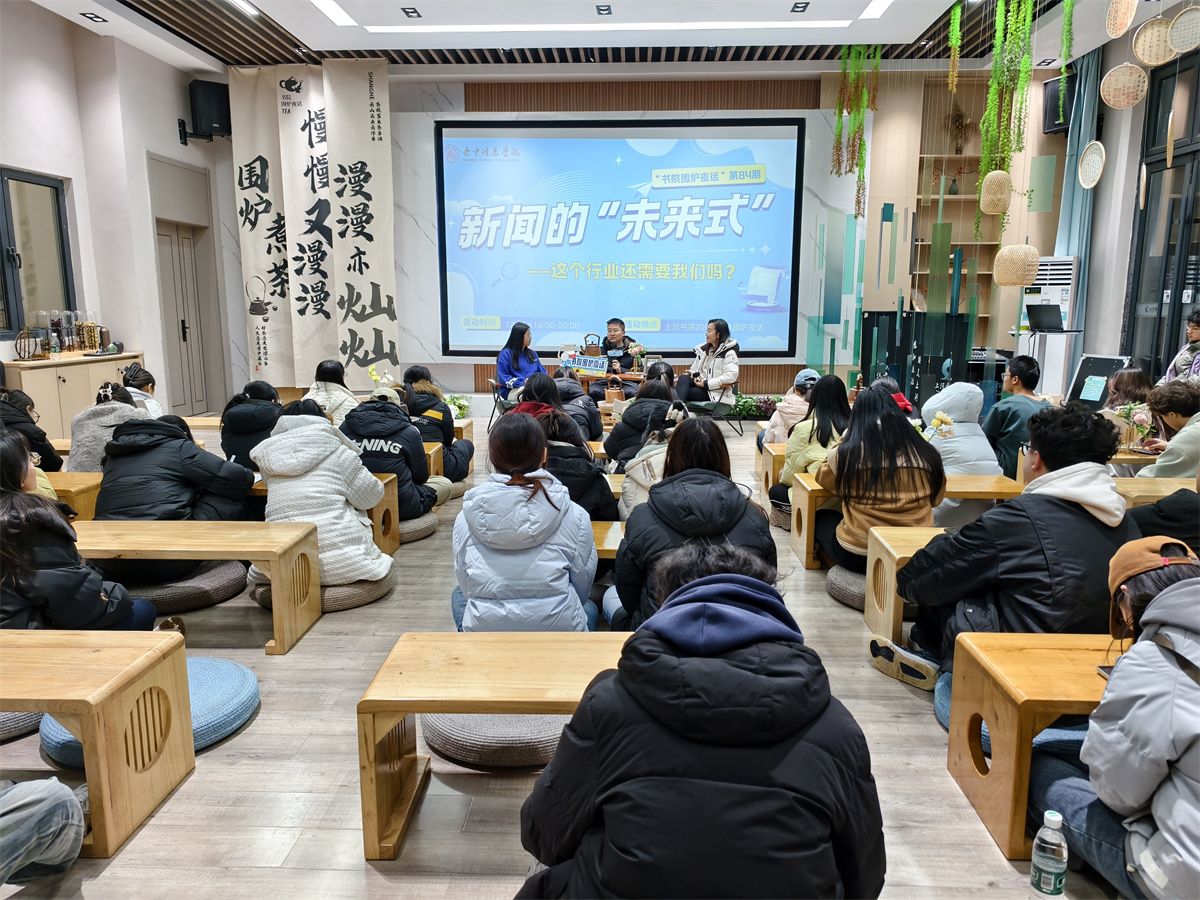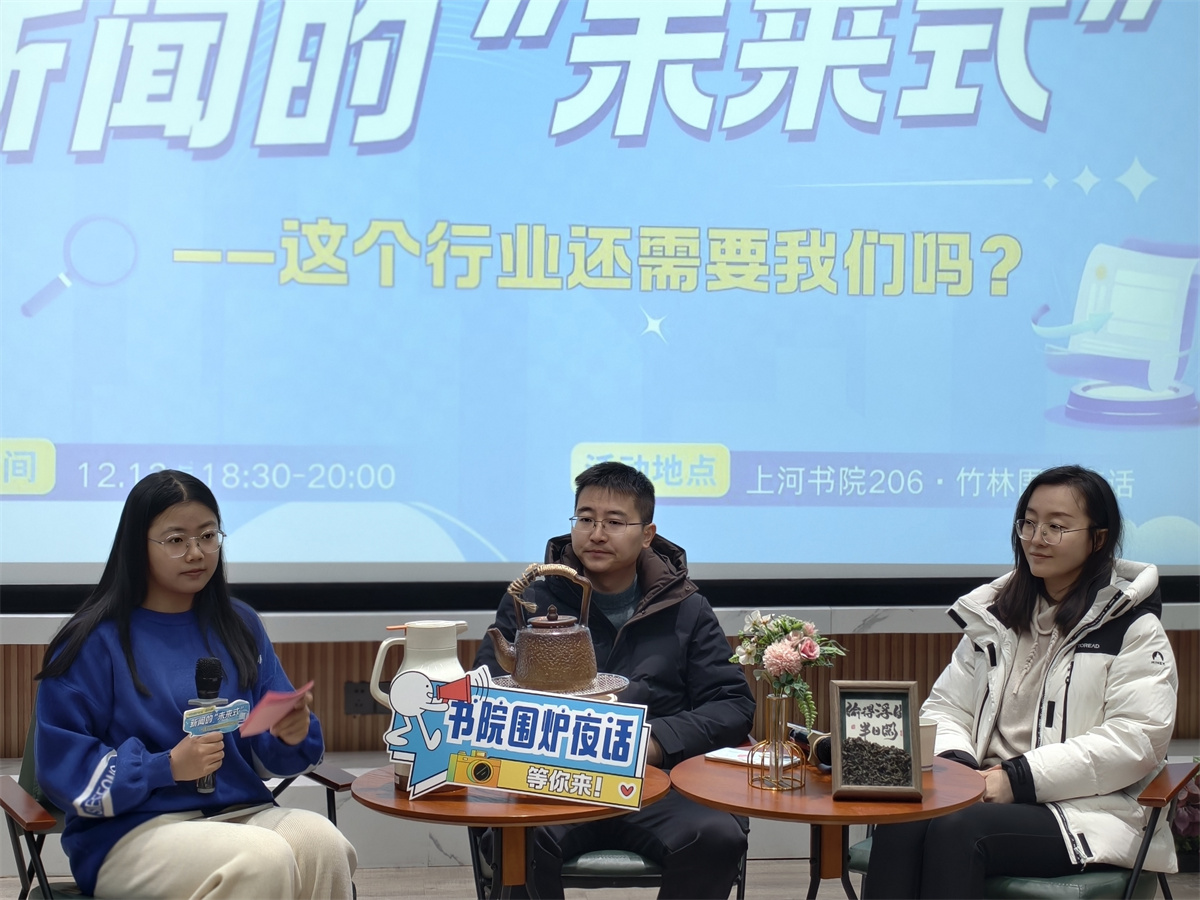 带着这些疑问,18:30,一场以“新闻的未来式”为主题的围炉夜话于学校上河书院206竹林·围炉夜话空间展开。高珧老师与学校新闻采写产业学院崔欢欢老师、李金凤同学及50余名师生代表共同交流。