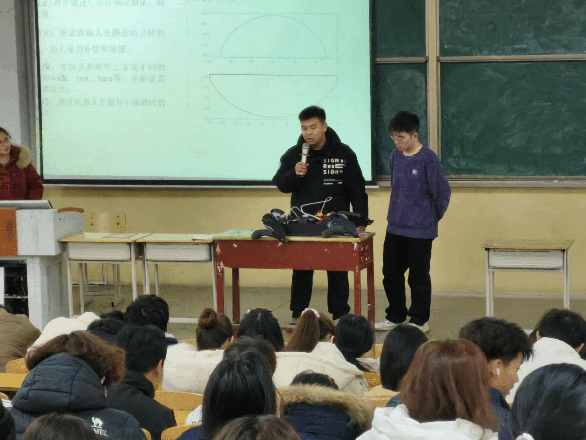 演示过程中,学生团队成员不仅是操作者,更是专业的讲解员。他们围绕机器狗的项目背景、机械结构设计、控制系统架构、传感器集成、算法核心等关键技术要点,进行了生动而专业的讲解。他们分享了从概念设计、图纸绘制、零件加工、到编程调试、迭代优化的完整研发过程,其中遇到的挑战、解决的思路以及团队协作的点滴,让台下同为工科背景的学子深感共鸣。