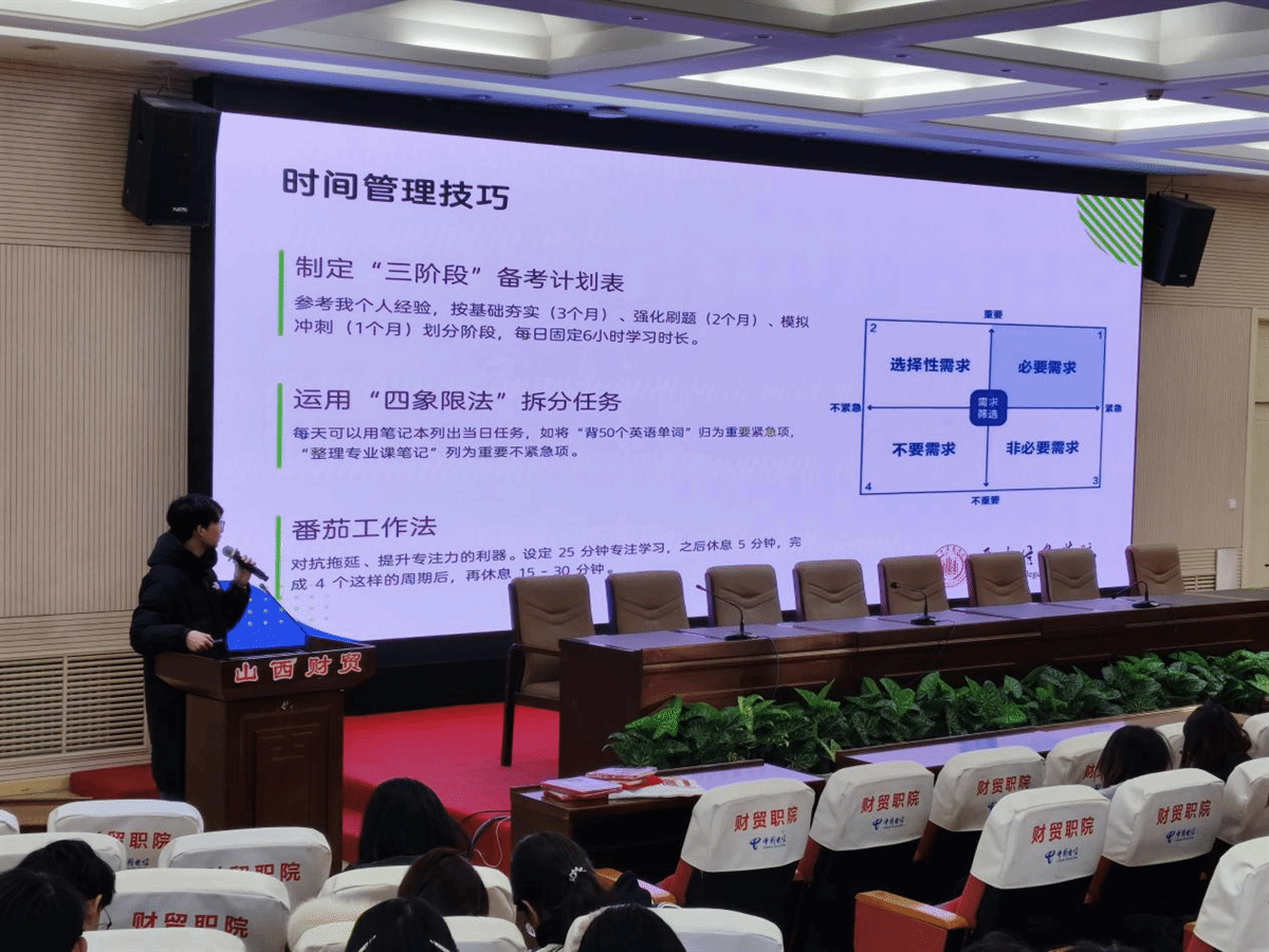 在备考经验部分,郝崇丞从“政策解读”“、备考计划”、“资源整合”、“时间管理”、“心态调整”五个方面进行了系统分享。他详细介绍了山西省专升本考试的最新政策、科目设置与分值分布,并结合自身备考经历,推荐了实用的学习方法与工具,如“三阶段计划表”、“四象限任务法”、“番茄工作法”等。