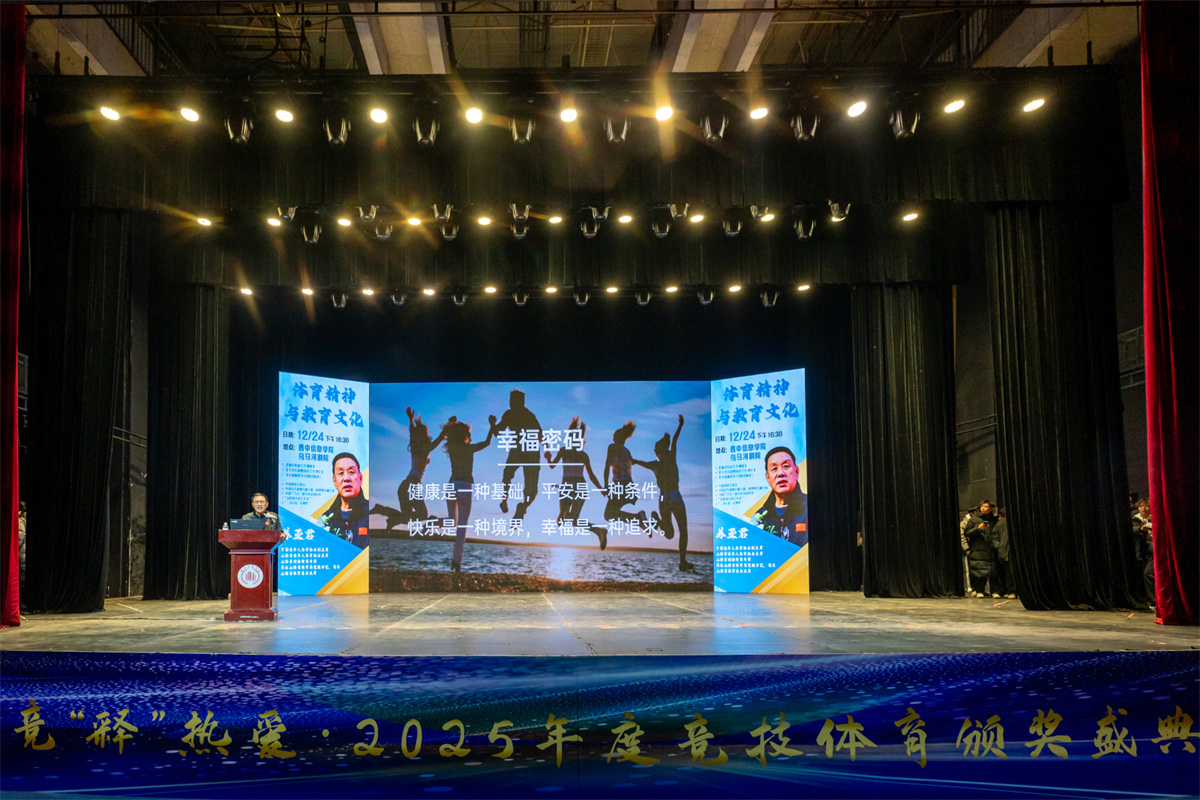 竞技体育颁奖盛典结束后,原任山西省体育局党组书记、局长,山西省体育总会主席,现任中国老年人体育协会副主席、山西省老年人体育协会主席苏亚君先生以“体育精神与教育文化”为主题,深挖“以体育人”的精神内核,与大家共同探讨体育精神与教育文化的深度内涵,带来了一场兼具深度与温度的讲座。苏亚君先生在讲座中通过阐释“国运兴则体育兴;国家强则体育强”,解读中华体育精神的内核——为国争光、无私奉献、科学求实、遵纪守法、团结协作、顽强拼搏,将奥运精神与中国体育发展的实践相结合,让现场师生对体育精神有了更深刻的理解。他特别强调“体育是最好的教育”,指出学校发展离不开懂体育的校长,体育不仅能锤炼体魄,更能塑造品格、涵养精神,是教育文化中不可或缺的重要部分。