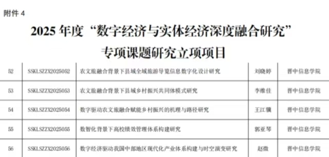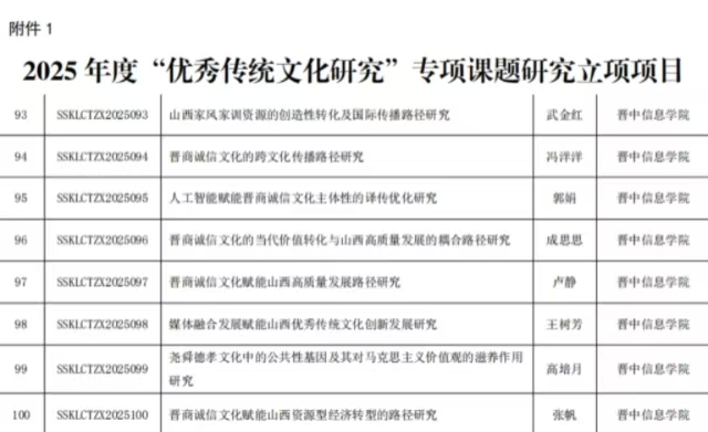 近日,山西省社会科学界联合会发布《关于“2025年度山西优秀传统文化研究等专项课题”的立项通知》,晋中信息学院共有14项课题获批立项,立项数量位居同类院校前列。