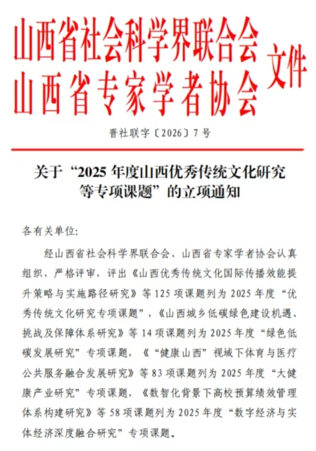 此次获批的14项课题覆盖三个专项类别,研究内容呈现出鲜明的特色:一是聚焦地方优秀传统文化,在“优秀传统文化研究”专项中获批8项,研究涉及晋商诚信文化、家风家训资源、德孝文化等山西特色文化主题,突出文化传承与创新;二是紧跟时代发展需求,在“数字经济与实体经济深度融合研究”专项中获批5项,围绕农文旅融合、乡村振兴、数智化绩效管理等现实问题开展研究;三是注重跨学科交叉与技术创新,在“绿色低碳发展研究”专项中获批1项,将技术应用于传统文化领域,体现了多学科融合的研究趋势。