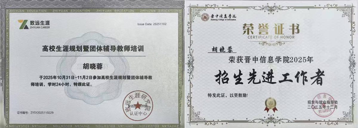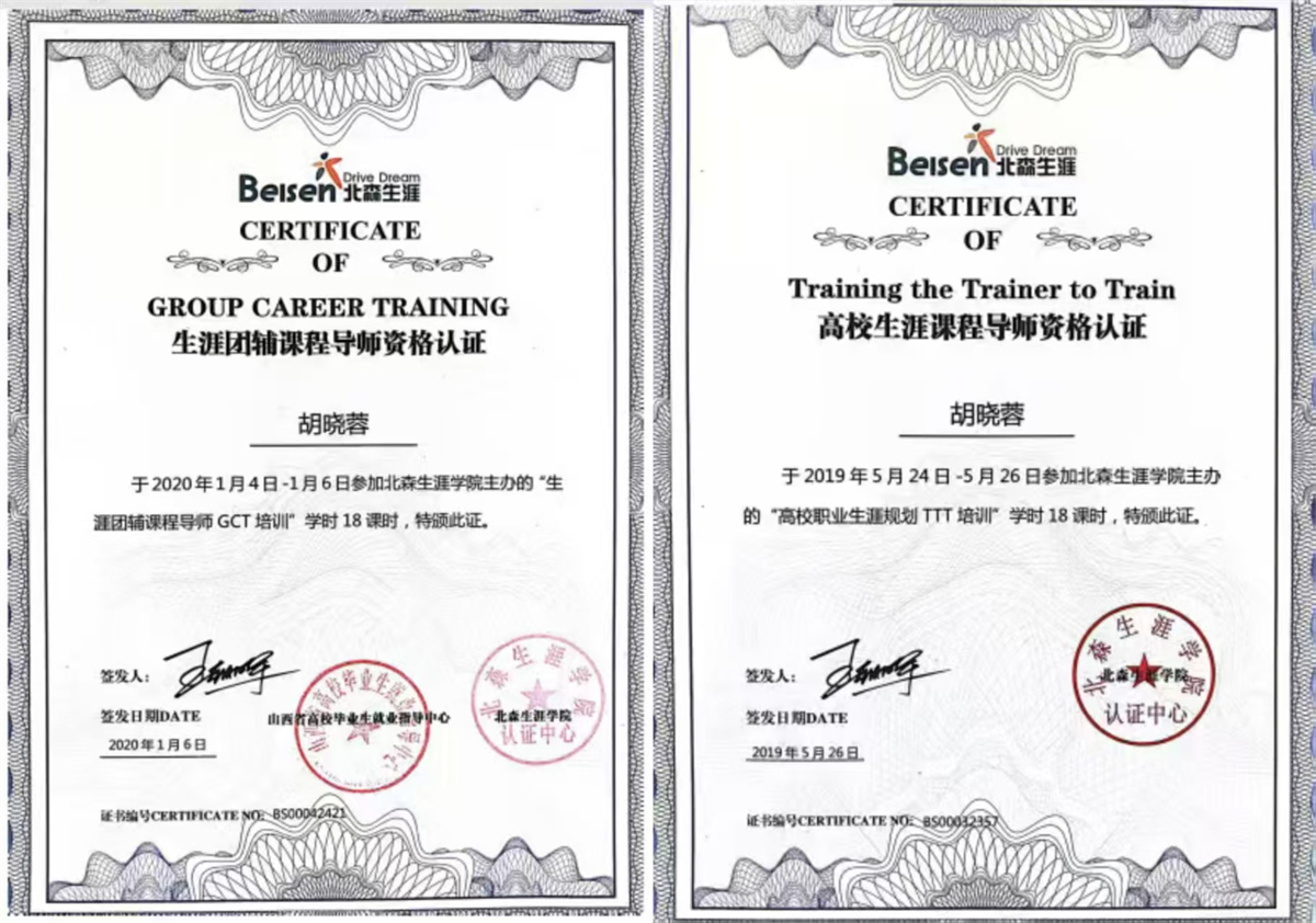 编者按:胡晓蓉,女,中共党员,讲师,山西大学高等教育学硕士。2014年2月入职晋中信息学院,招生与就业指导处专职人员。十年《大学生职业生涯规划与就业指导》课程授课经验,就业创业导师库导师、信息工程学院全生异科导师、GCDF全球职业规划师、BCF北森生涯规划师、BCC全球生涯教练、TTT高校生涯课程导师、TTT2高校就业指导师、GCT生涯团体辅导导师。工作期间参与省级教改课题1项,发表学术论文2篇,多次获得学校“先进教育工作者”和“就业创业工作先进个人”荣誉称号。