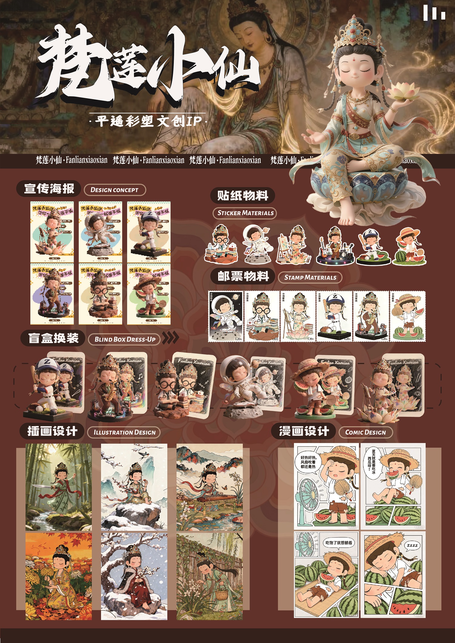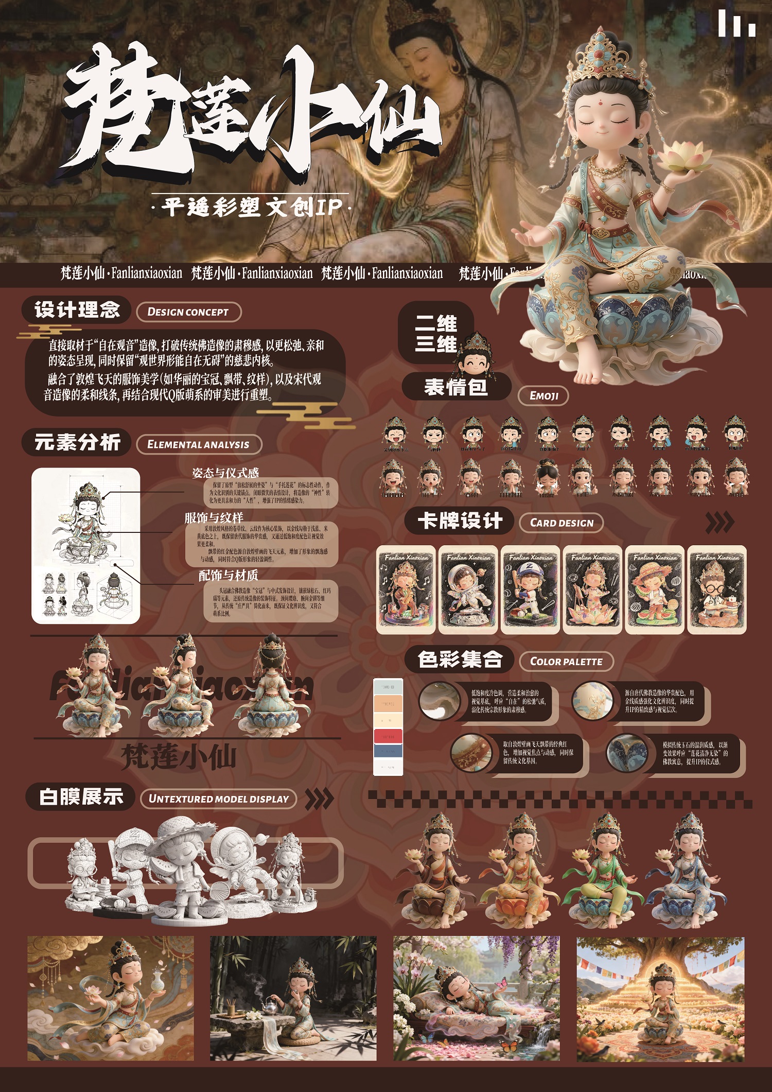 本次获奖作品《悠逸仙音IP全案设计》,是杏花书院师生团队在聂宁与王浩天两位老师的全程悉心指导下,历经近两个月深度打磨完成的创意成果。作品立足山西本土文化根脉,以弘扬山西古代雕塑文化为核心方向,团队在深入研究山西传统艺术精髓的基础上,最终选定山西平遥双林寺自在观音像为设计参考原型,明确了作品的创作基底。值得一提的是,为精准把握设计方向、找准作品定位,两位老师广泛搜集国内外优秀IP设计案例进行深度剖析与总结,结合赛事评审标准,逐步梳理出完整的创作逻辑与设计框架。该作品作为一套完整的IP全案设计,内容涵盖主形象打造、三视图规范、主题海报设计、衍生物料开发、数字化内容创作、表情包设计、变装形象规划、3D模型搭建、全套盲盒设计以及现实场景应用与包装设计等多个维度,实现了传统美学与现代设计的深度融合。
