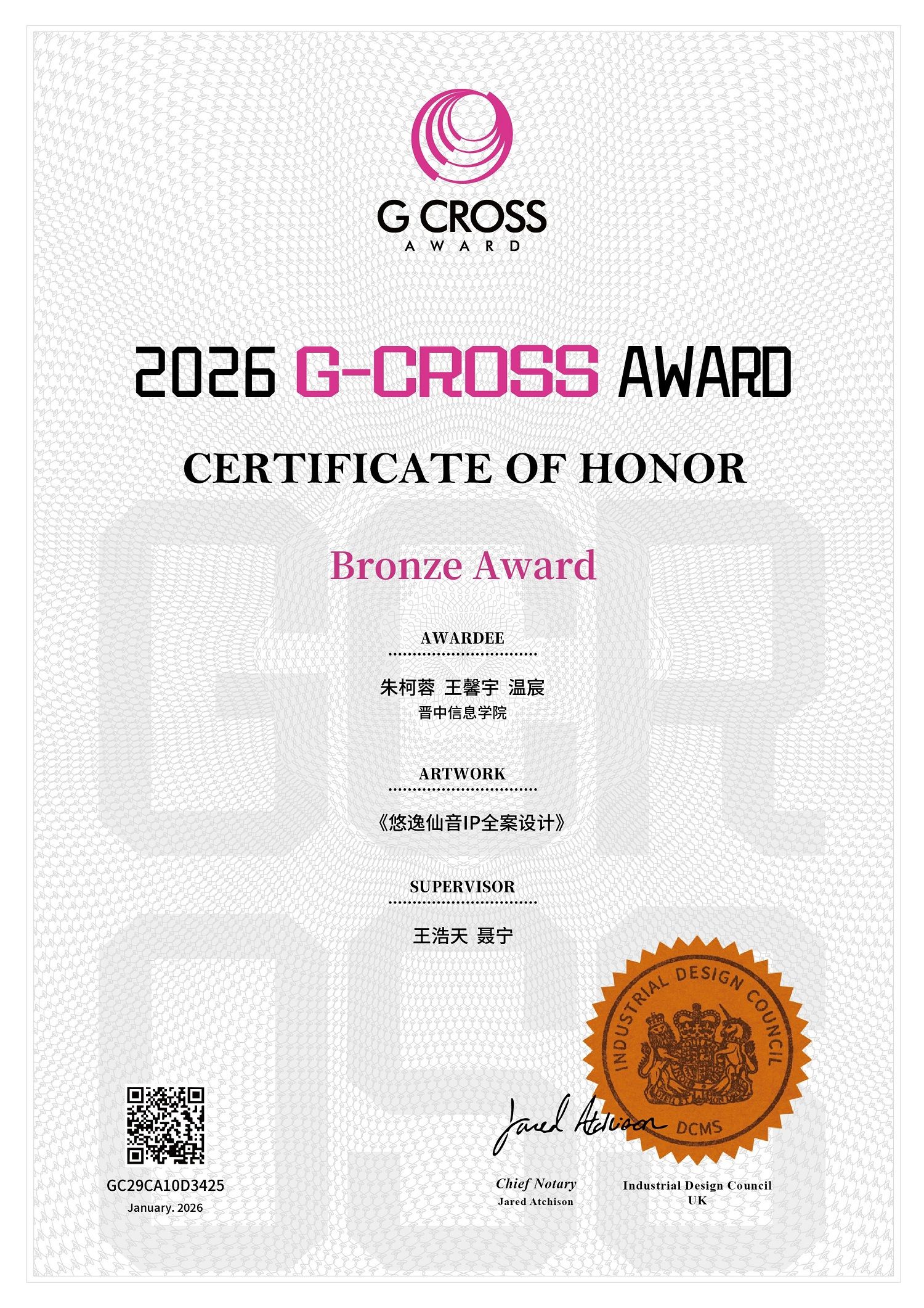 近日,2026G-CROSS国际创意奖获奖名单揭晓,晋中信息学院杏花书院朱柯蓉、王馨宇、温宸的作品《悠逸仙音IP全案设计》,在全球众多参赛作品中脱颖而出,荣获国际级铜奖。杏花书院聂宁、王浩天两位老师获优秀指导教师荣誉称号。