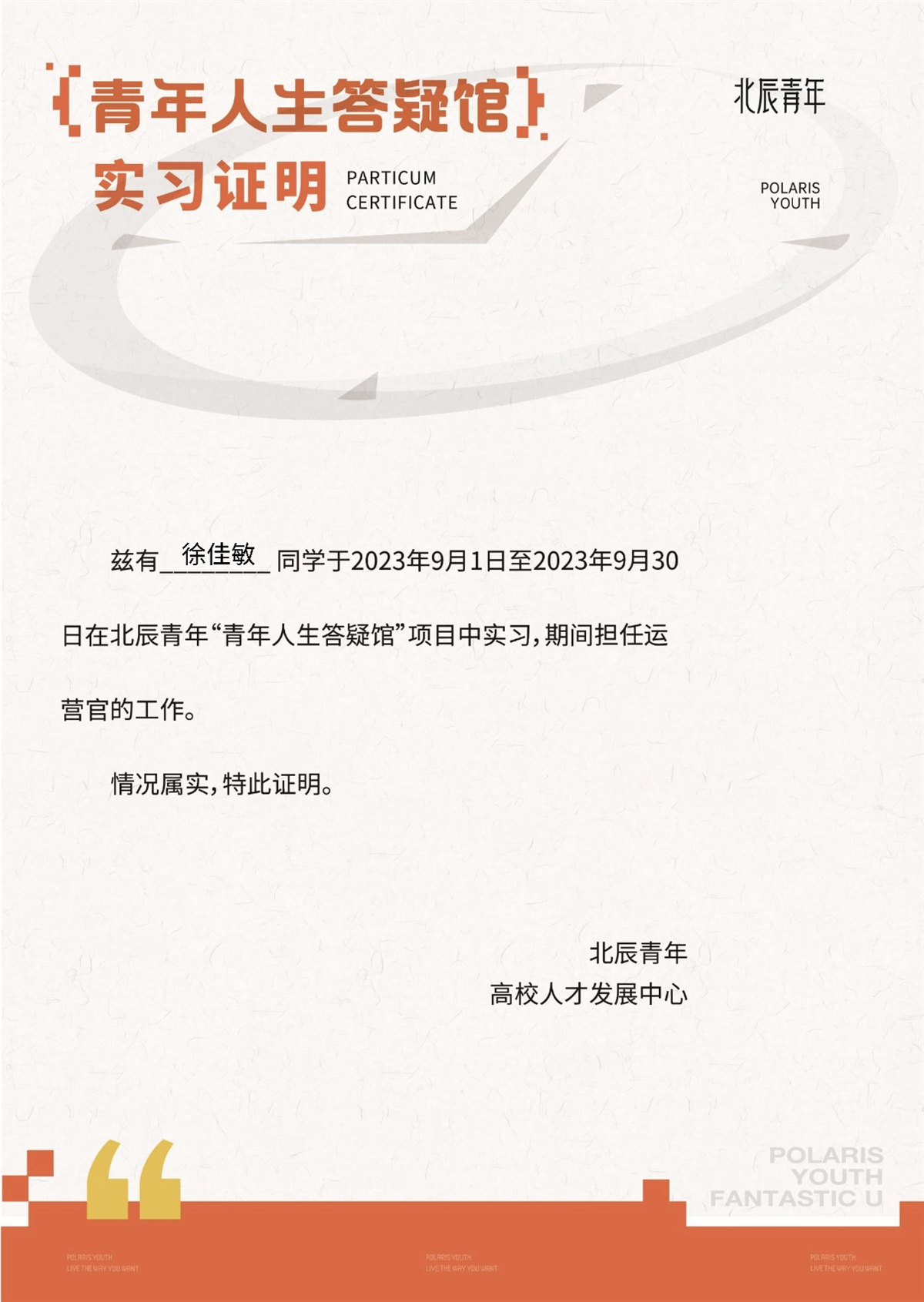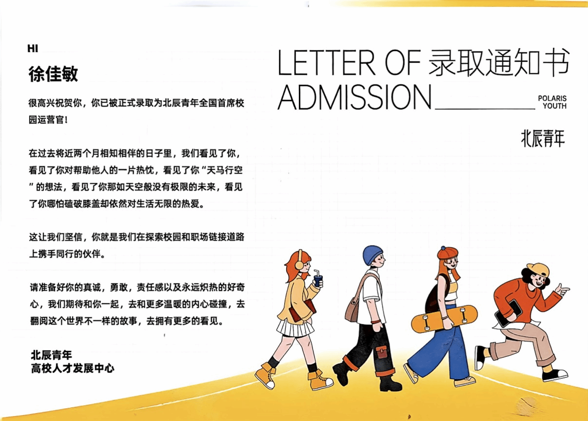 同时,徐佳敏凭借在校级新媒体团队练就的运营经验,积极报名“北辰青年”校园运营官,并作为共创方代表为学校拿下了“稻田展览计划”共创项目,成功在大一假期便收获了人生第一份offer和实习证明。学校所搭建的多元实践平台,令她意识到“勇敢的人先享受世界”。