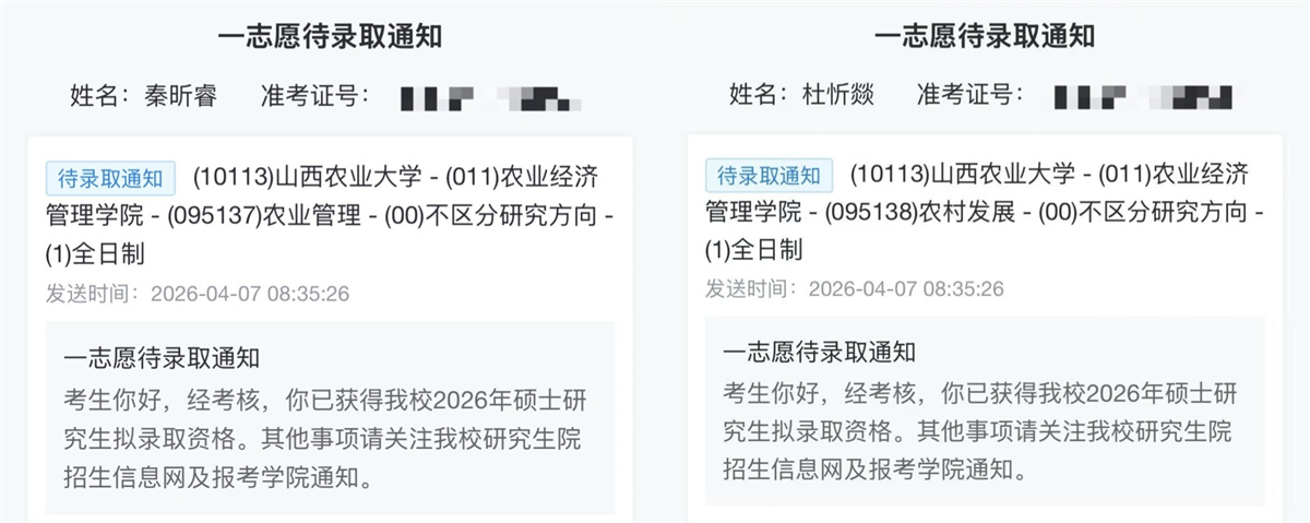 初试成绩公布那天,两人一起查询——双双通过。复试备考阶段,他们继续相互抽背、模拟面试。同时,他们积极参加学校免费开设的讲座,学院教授和专业课老师也悉心指导面试技巧,辅导员全程关注他们的心理状态,及时疏导压力。最终,秦昕睿以综合成绩第九名考取山西农业大学农业管理专业,杜忻燚以综合成绩第五名考取同校农村发展专业。从决定考研到双双录取,他们一步步将共同的梦想变成现实。