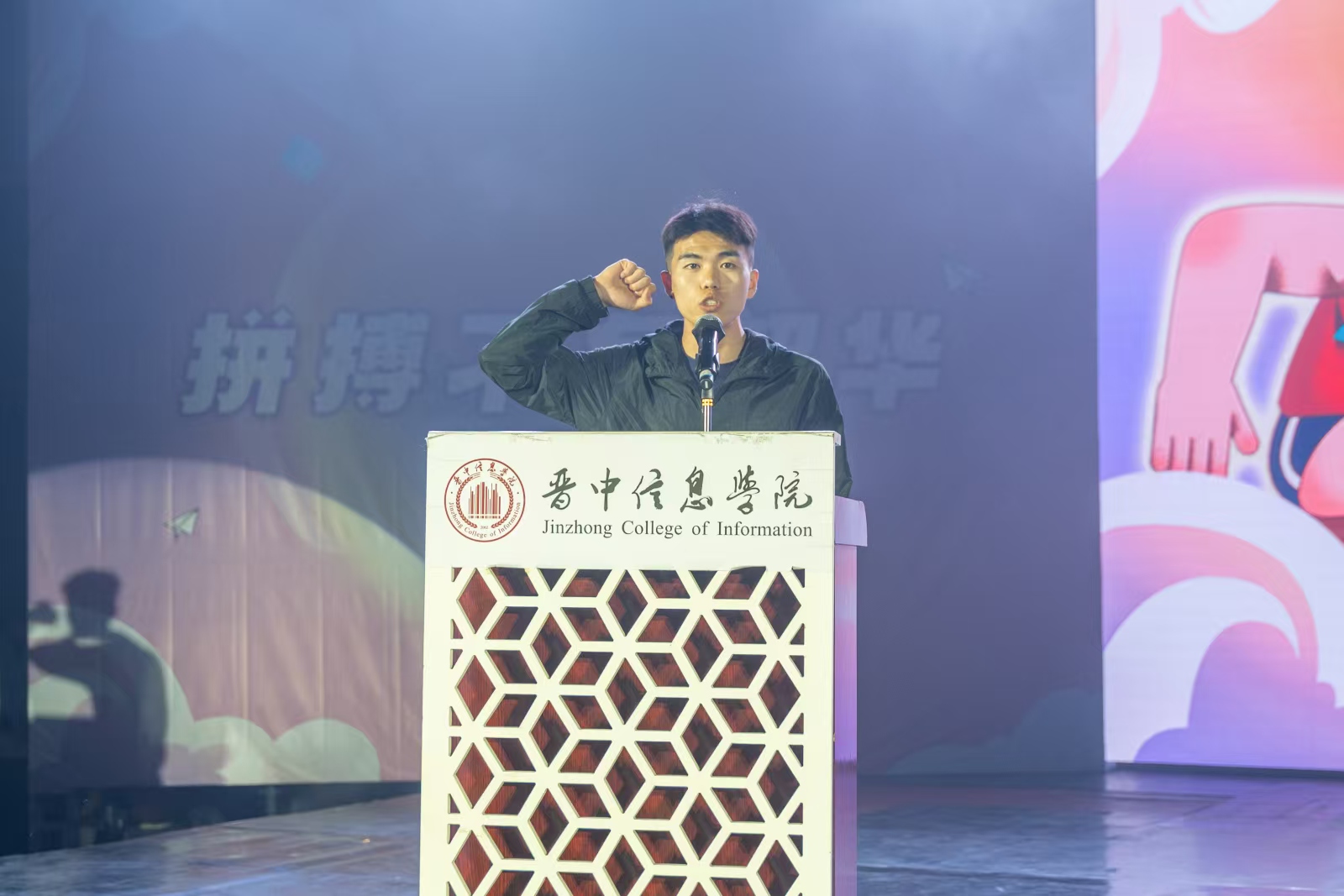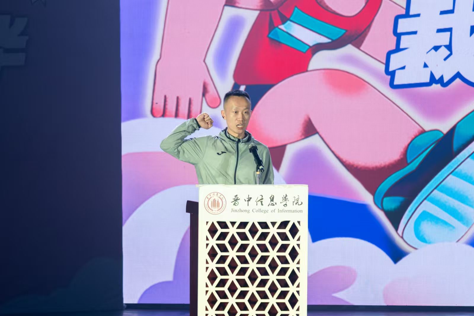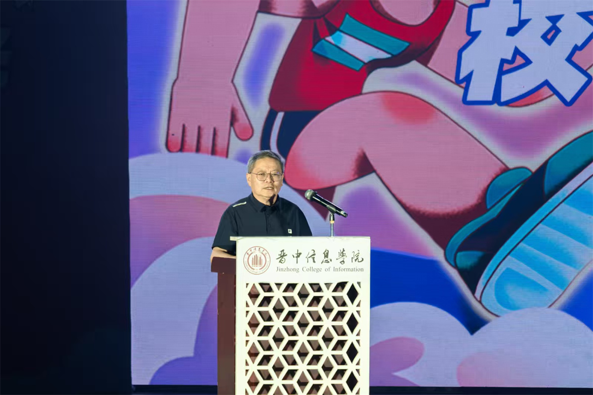 校长姬宇致辞,向运动会的召开表示热烈祝贺,向全体运动员、裁判员及工作人员致以诚挚问候。他指出,体育是立德树人的重要载体,学校始终坚守“健康第一”的教育理念,以完满教育为抓手,持续丰富校园体育文化,为学生全面发展搭建广阔平台。他特别提到,2026年2月教育部发布《关于全面推进健康学校建设的指导意见》后,学校第一时间响应,迅速修订出台《晋中信息学院学生体质健康提升实施办法》,将体质健康纳入人才培养全过程,让强健体魄、健全人格、坚韧意志成为信院学子的鲜明标识。他勉励全体运动员恪守体育精神、奋勇拼搏、超越自我,在赛场上收获成长与力量,以青春之我、奋斗之我书写人生精彩篇章。