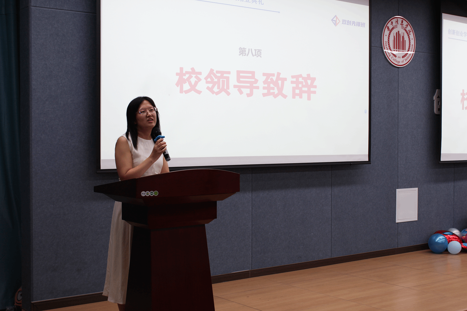 典礼最后,校长助理杨碧霞致辞,她对第四期双创先锋班取得的显著成果给予高度评价,并送大家三重心意:首先珍惜信院“四位一体双院制”的人才培养模式,将完满之彩、通识之博、商科之实、竞赛之锐的宝贵历练,熔铸成你们人生旅途中最璀璨的星辰,必将照亮前行的征途;其次是应对变局的双创锦囊,有突破常规的创新思维,有笃定前行的坚韧不拔,有抽丝剥茧的思辨之能;最后是相伴终身的双创灯火,照亮学员探索的商业道路,温暖学员疲惫的心灵,希望同学们今后能够带着这份温暖与力量,勇敢地前行,在人生的道路上创造属于自己的辉煌。