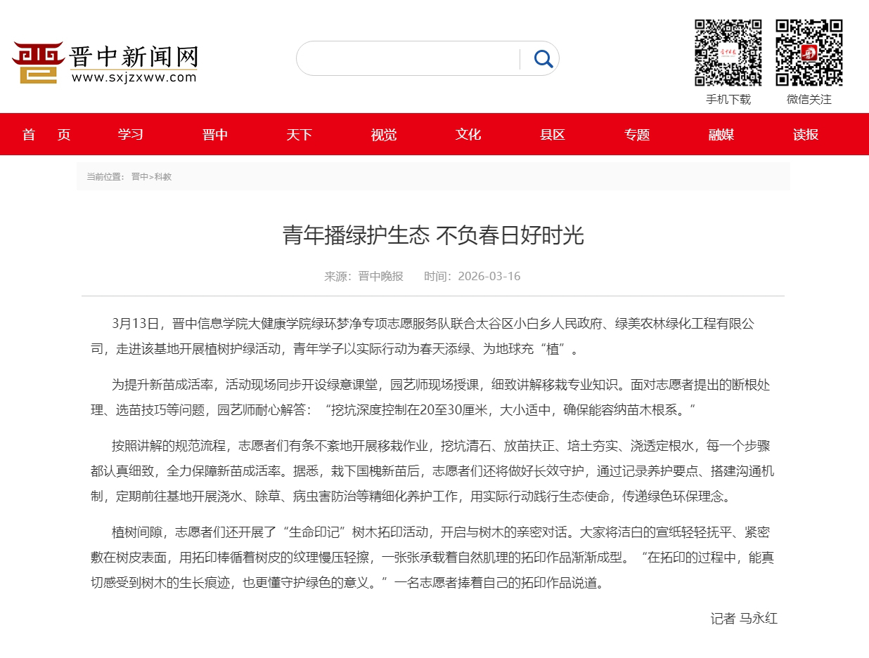 3月13日,晋中信息学院大健康学院绿环梦净专项志愿服务队联合太谷区小白乡人民政府、绿美农林绿化工程有限公司,走进该基地开展植树护绿活动,青年学子以实际行动为春天添绿、为地球充“植”。