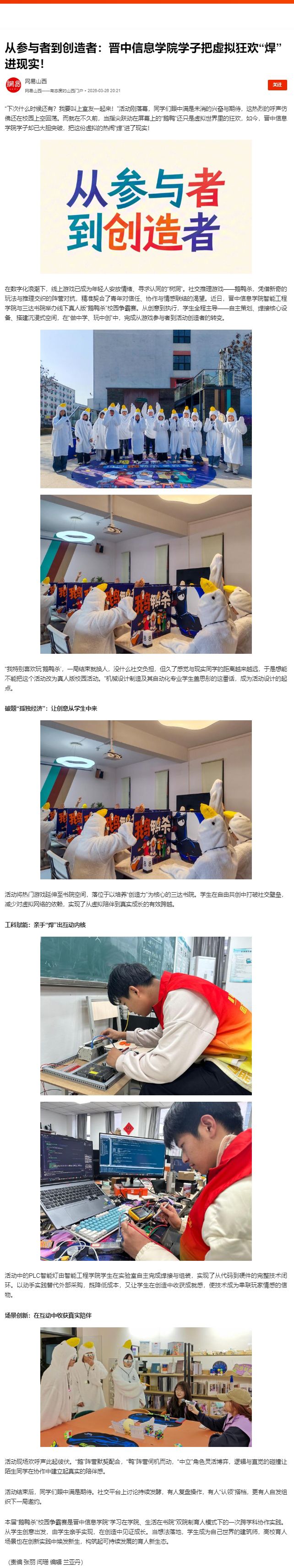 本届“鹅鸭杀”校园争霸赛是晋中信息学院“学习在学院、生活在书院”双院制育人模式下的一次跨学科协作实践。从学生创意出发,由学生亲手实现,在创造中见证成长。当想法落地,学生成为自己世界的建筑师,高校育人场景也在创新实践中焕发新生,构筑起可持续发展的育人新生态。