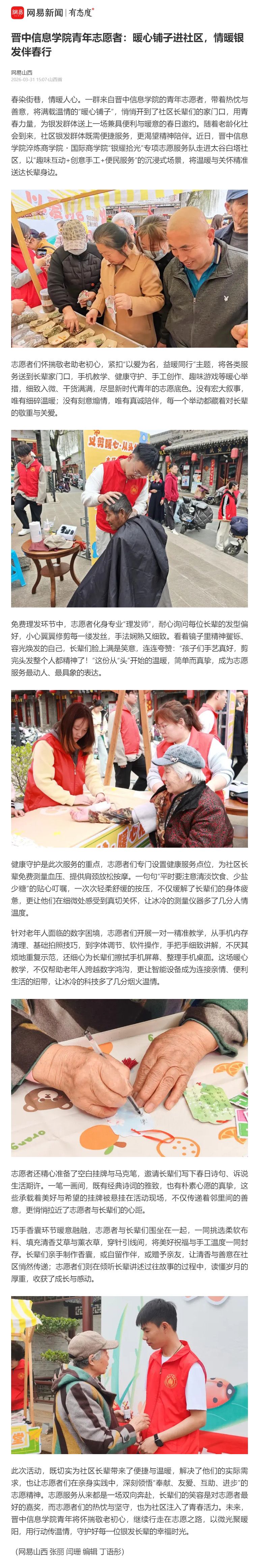 此次活动,既切实为社区长辈带来了便捷与温暖,解决了他们的实际需求,也让志愿者们在亲身实践中,深刻领悟“奉献、友爱、互助、进步”的志愿精神。志愿服务从来都是一场双向奔赴,长辈们的笑容是对志愿者最好的嘉奖,而志愿者们的热忱与坚守,也为社区注入了青春活力。未来,晋中信息学院青年将怀揣敬老初心,继续行走在志愿之路,以微光聚暖阳,用行动传温情,守护好每一位银发长辈的幸福时光。