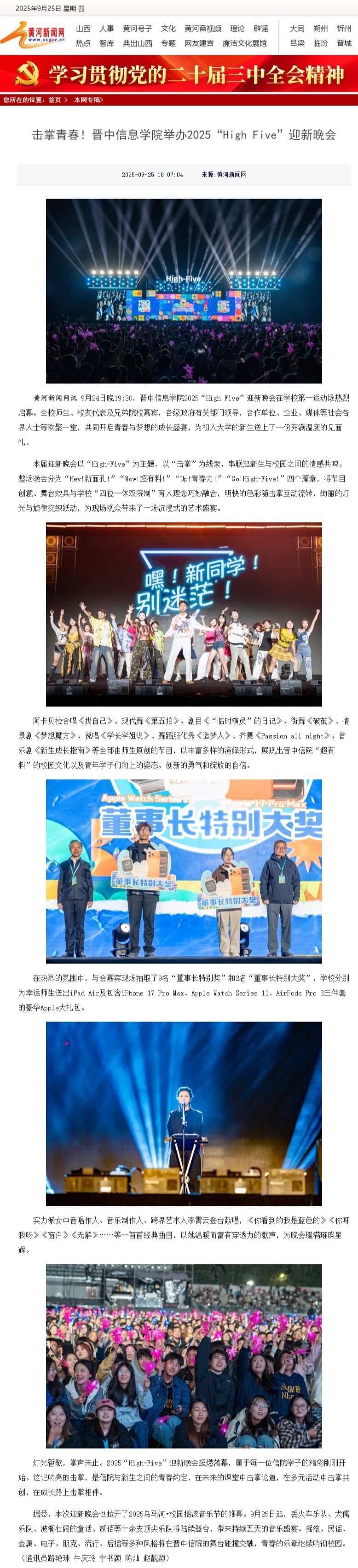 黄河新闻网讯 9月24日晚19:30,晋中信息学院2025“High Five”迎新晚会在学校第一运动场热烈启幕。全校师生、校友代表及兄弟院校嘉宾,各级政府有关部门领导,合作单位、企业、媒体等社会各界人士等欢聚一堂,共同开启青春与梦想的成长盛宴,为初入大学的新生送上了一份充满温度的见面礼。