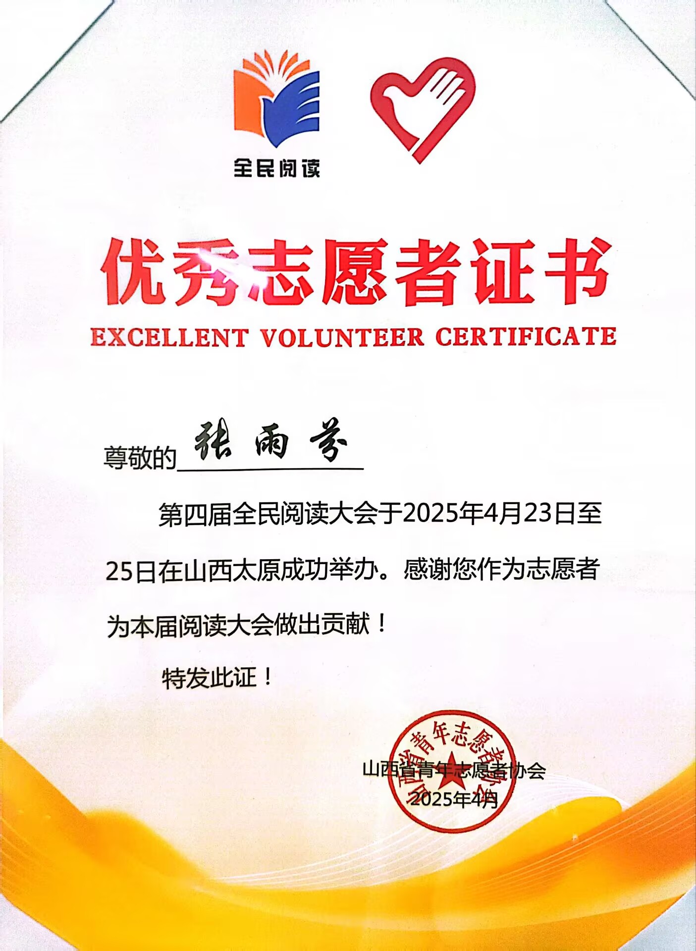第四届全民阅读大会我校志愿者荣获“优秀志愿者”荣誉称号。